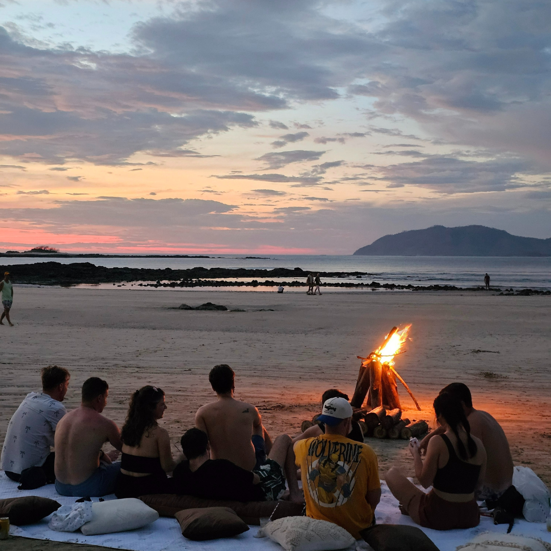 A cozy beachfront bonfire with blankets, drinks, snacks, and incredible sunset views